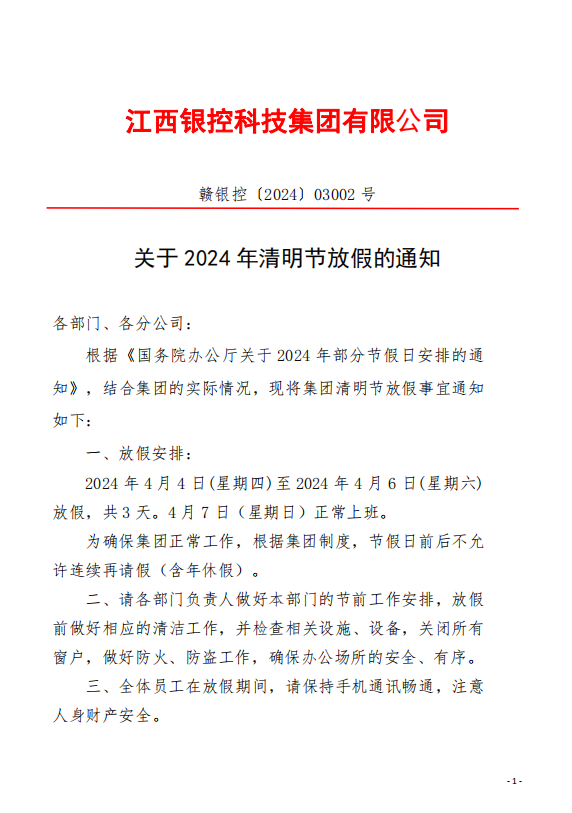 江西銀控科技集團有限公司清明節(jié)放假通知